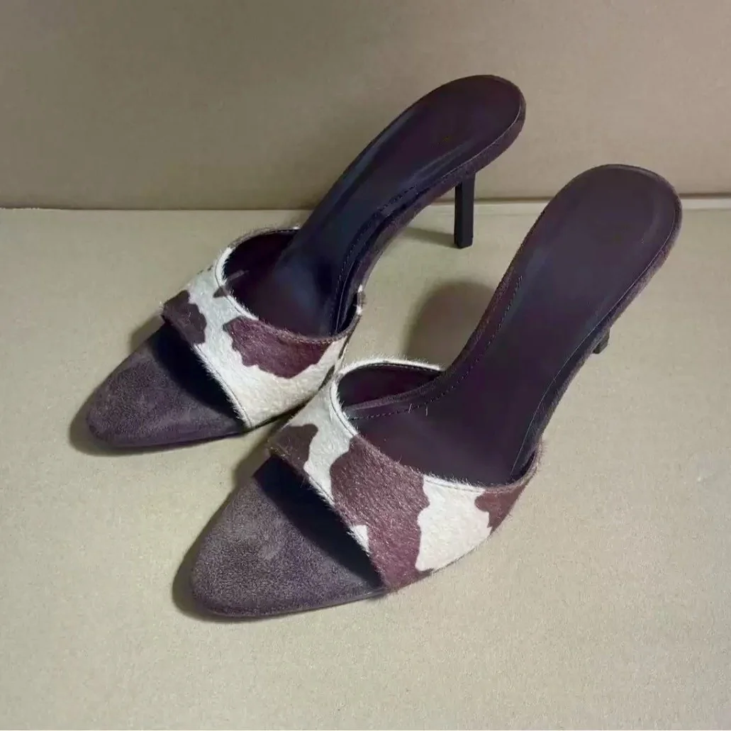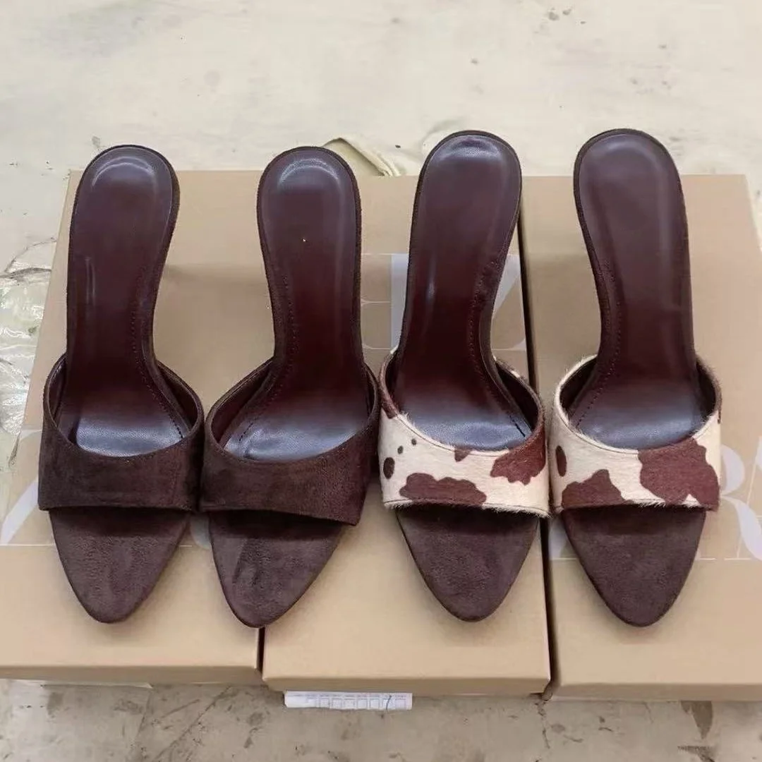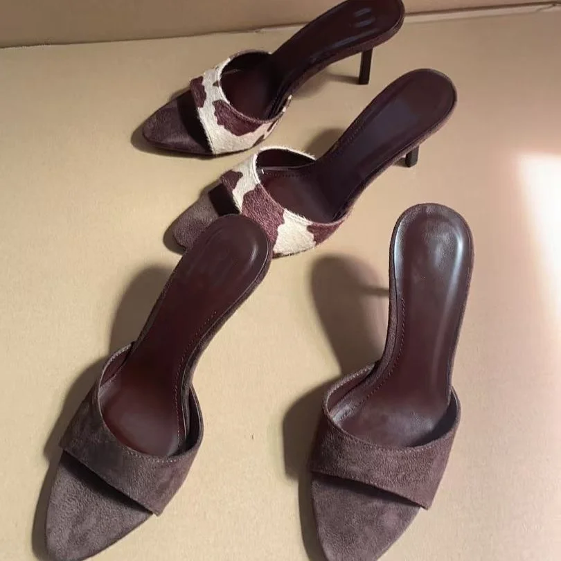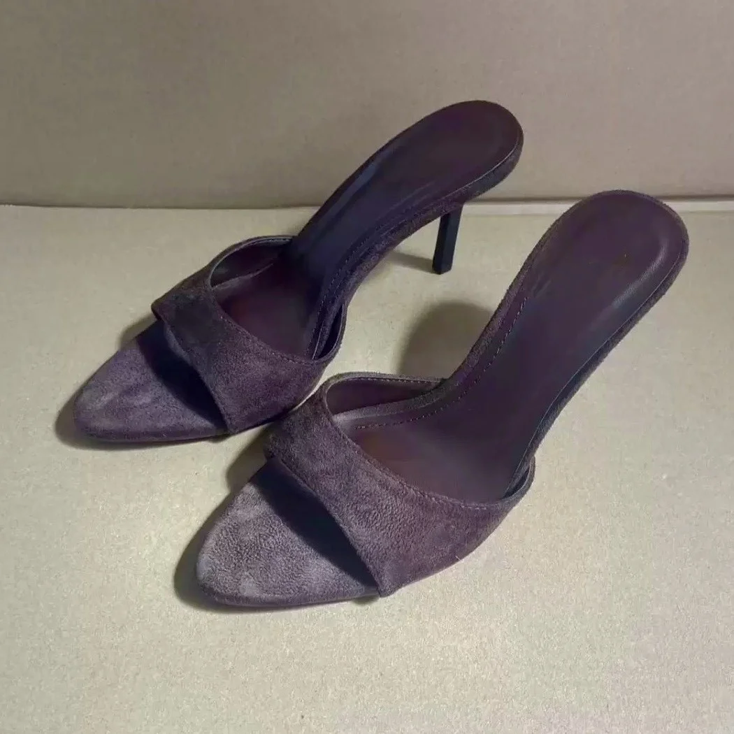 QuiteS 2026 New Summer Suede Pointed Toe Open Toe Backless Thin Heel High Heel Sandals Casual Sex Shoes for Women